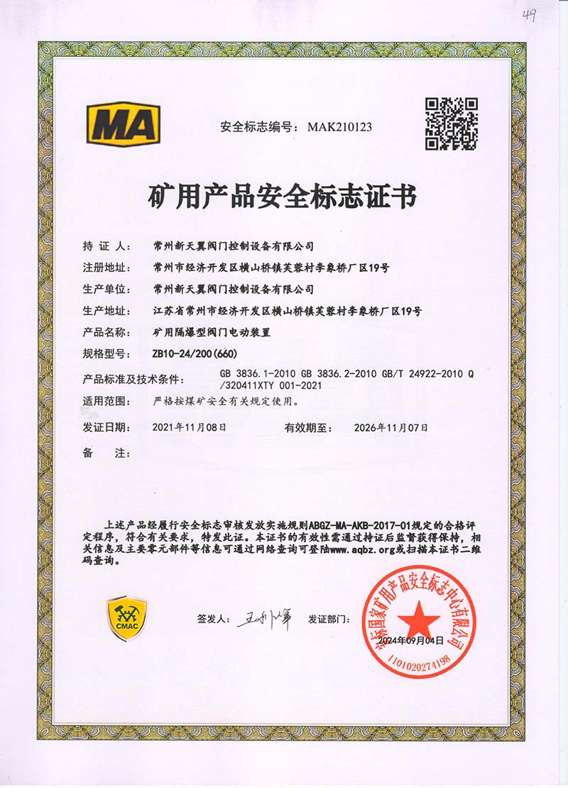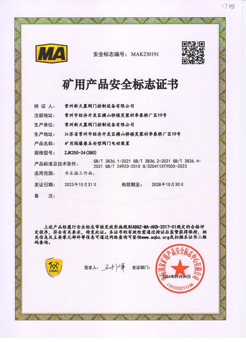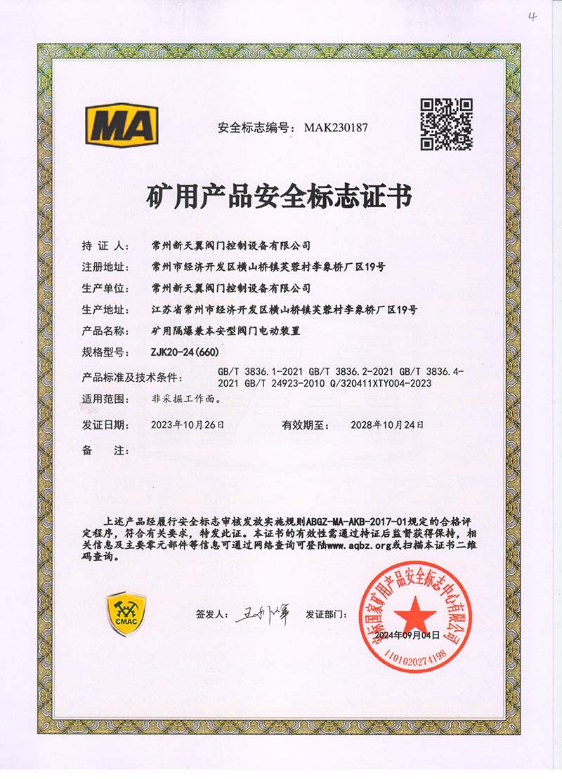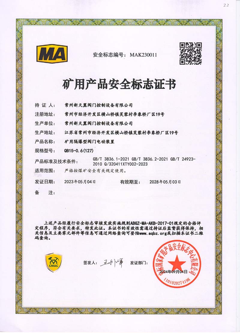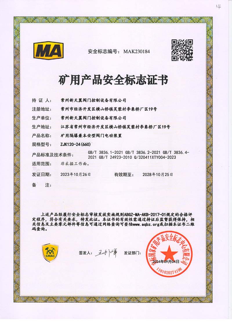 礦用隔爆ZB10-24中國國家強制性產品認證證書110.1